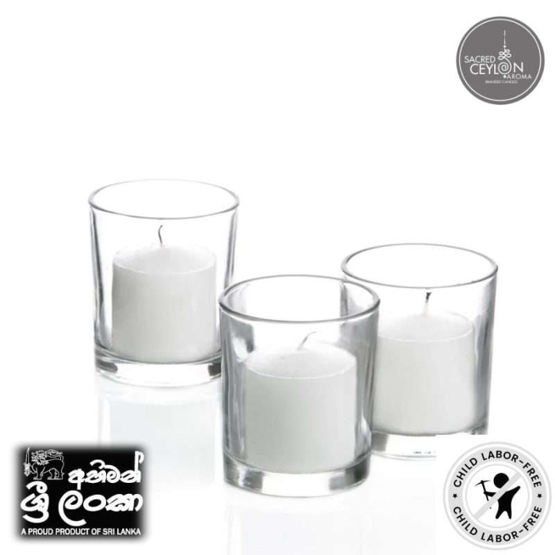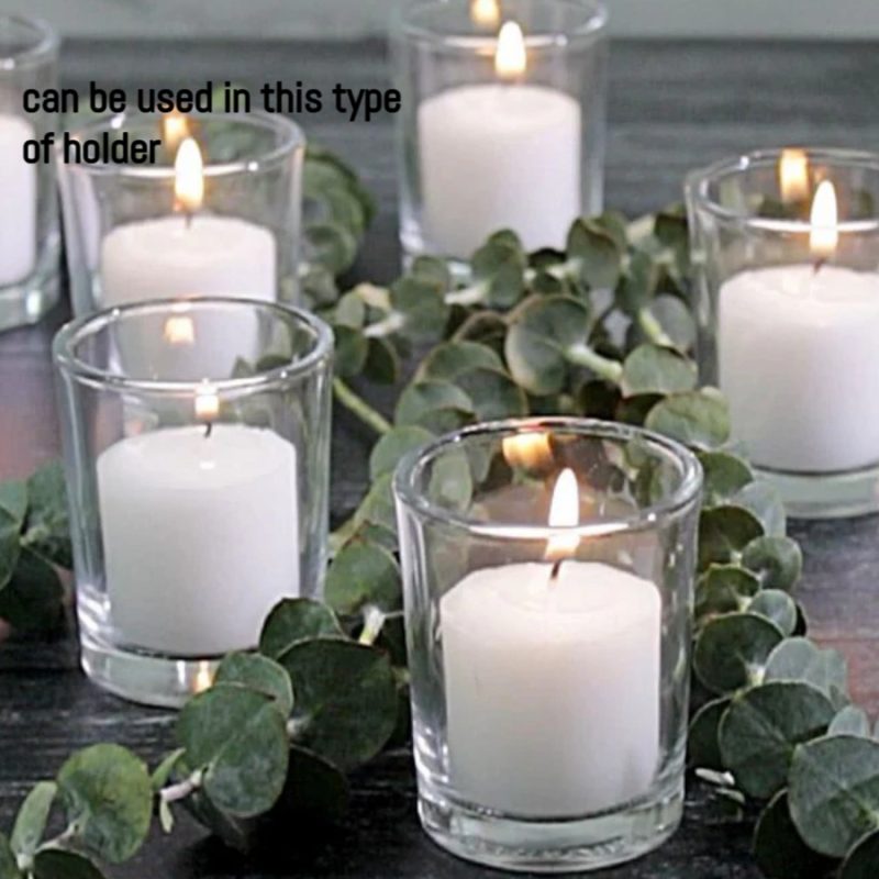 Gold Smoke – Votive Candles Unscented 1.5″ W- 1.5″ H with Glass Holder Set of 12 – White (glass and candle) (සුවඳ නැති ඉටිපන්දම් 1.5″ W- 1.5″ H වීදුරු රඳවන කට්ටලයක් සහිත 12 – සුදු වර්ණය (වීදුරු සහ ඉටිපන්දම))